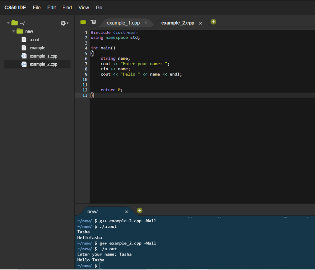 Okay so now that you have a directory and c++ file created in CS50 IDE (if not see here how to do so,) we are going to look into how we can create a basic piece of coding that with take an input from a user and read out some text. To start the code we’re going to want to include some libraires (#include <iostream>) and specify a namespace (using namespace std;) that will just make the code able to work with the correct data, as well as make the code easier to write.