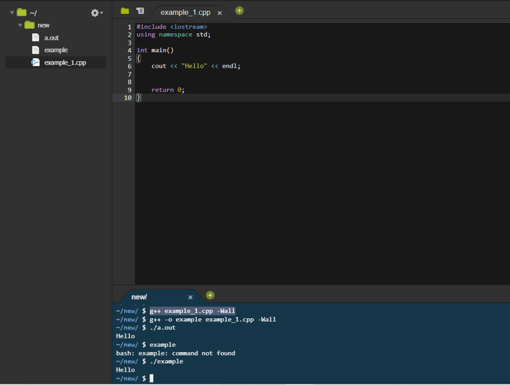 - Now to run this code it first needs to be compiled. If you are using CS50 then it has an inbuilt compiler called g++ other coding envirnoments may need an external compiler. To compile our code type (g++ example_1.cpp -Wall) into the terminal. If no error messages occur then your code has been compiled successfully, if you have error messages ensure that everything is spelled correctly and the right symbols are all in place.